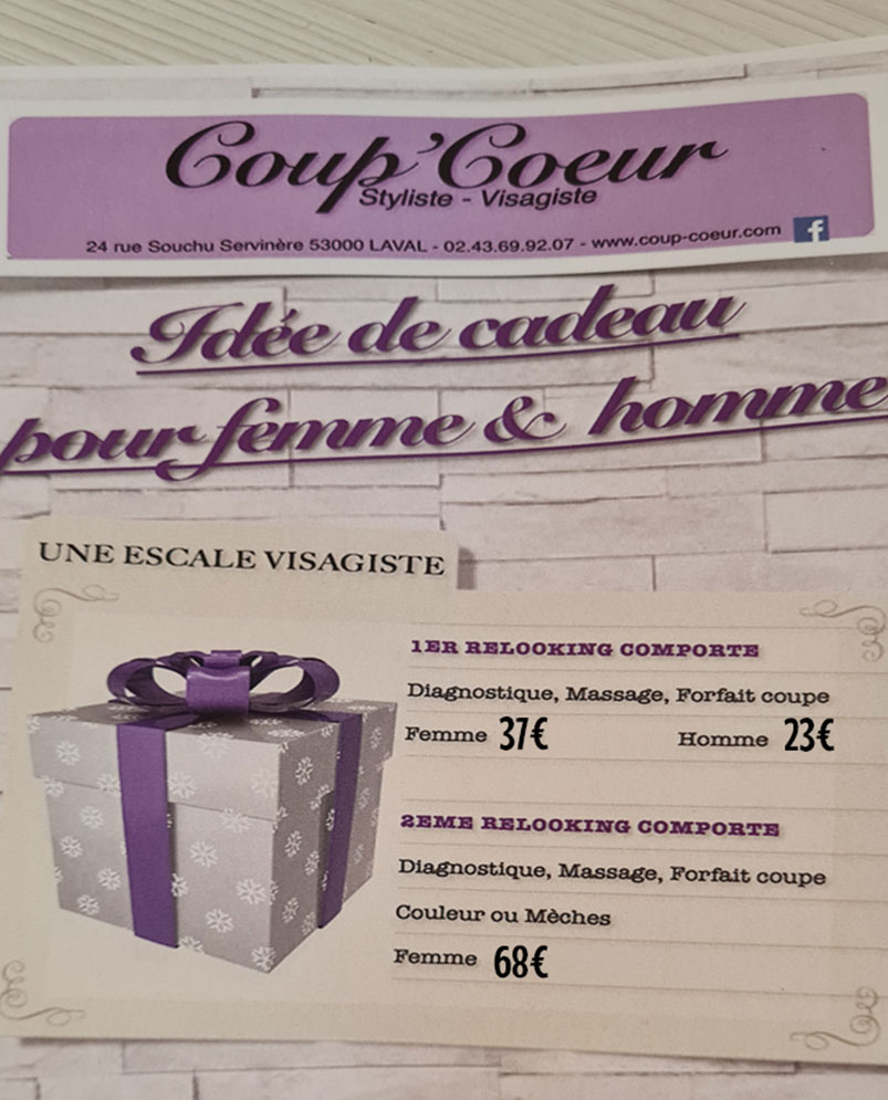 Situé à Laval en Mayenne (53), le salon de coiffure Coup'Coeur vous propose des idées cadeaux uniques pour offrir une expérience de beauté inoubliable à vos proches : Un relooking complet à des tarifs abordables. Mary met son expertise et sa passion au service de chaque client pour leur offrir une expérience sur mesure et personnalisée.
